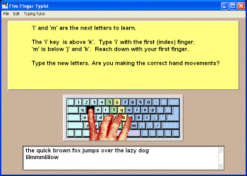 The advent of personal computers has made touch typing an important skill. Five Finger Typist teaches one-handed touch typing for both the right and left hands. The hand to be used is easily chosen.