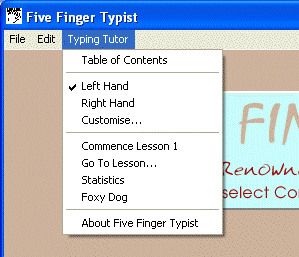 In Five Finger Typist the first 3 lessons introduce the home keys and the technique of one-handed touch typing. Thereafter each new lesson teaches two new characters, or is a revision lesson. In each lesson there are about 12 lines of exercises which initially teach typing of the new characters in relation to the home position.